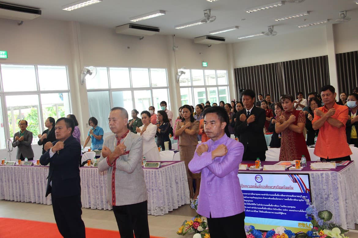 โดยก่อนการเริ่มประชุม นางจุรีรัตน์ พินิจมนตรี ผู้อำนวยการสำนักงานเขตพื้นที่การศึกษาชลบุรี เขต 3 ได้นำผู้เข้าร่วมการประชุม ร้องเพลงชาติ สวดมนต์ไหว้พระ และกล่าวคำปฏิญญาเขตสุจริต โดยพร้อมเพรียงกัน ณ ห้องประชุมโรงเรียนเฉลียวภาวนานุสรณ์ (ศึกษาพิเศษชลบุรี) อ.สัตหีบ จ.ชลบุรี