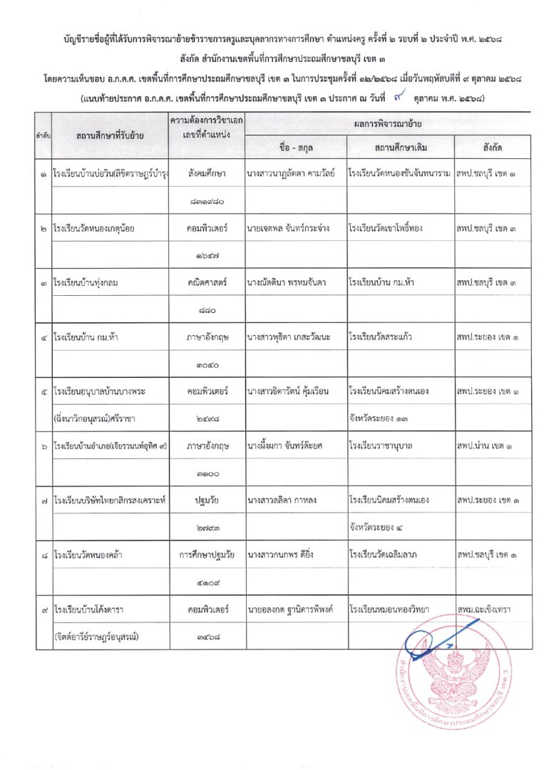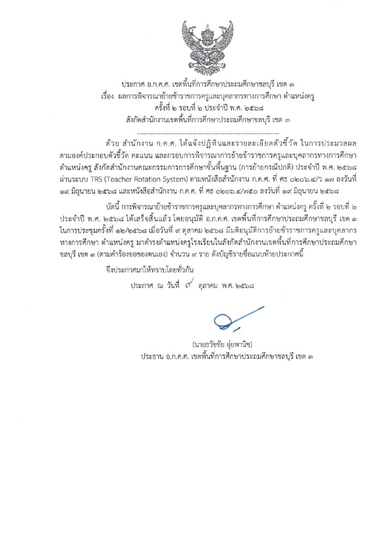 ประกาศสำนักงานเขตพื้นที่การศึกษาประถมศึกษาชลบุรี เขต 3 เรื่อง ผลการพิจารณาย้ายข้าราชการครูและบุคลากรทางการศึกษา ตำแหน่งครู (การย้ายกรณีปกติ) ประจำปี พ.ศ. 2568 ครั้งที่ 2 รอบที่ 2 ผ่านระบบ TRS (Teacher Rotation System) โดยอนุมัติ อ.ก.ค.ศ. เขตพื้นที่การศึกษาประถมศึกษาชลบุรี เขต 3 ในการประชุมครั้งที่ 12/2568 เมื่อวันที่ 9 ตุลาคม พ.ศ. 2568 มีมติอนุมัติการย้ายข้าราชการครูและบุคลากรทางการศึกษา ตำแหน่งครู มาดำรงตำแหน่งครู โรงเรียนในสังกัดสำนักงานเขตพื้นที่การศึกษาประถมศึกษาชลบุรี เขต 3 จำนวน 9 ราย