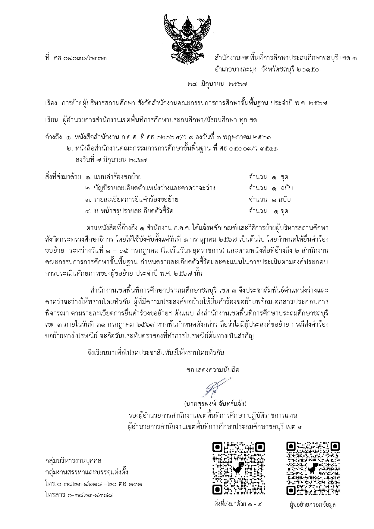การย้ายผู้บริหารสถานศึกษา สังกัดสำนักงานคณะกรรมการการศึกษาขั้นพื้นฐานประจำปีพ.ศ. 2567 สำนักงานเขตพื้นที่การศึกษาประถมศึกษาชลบุรี เขต 3 จึงประชาสัมพันธ์ตำแหน่งว่างและคาดว่าจะว่างให้ทราบโดยทั่วกัน