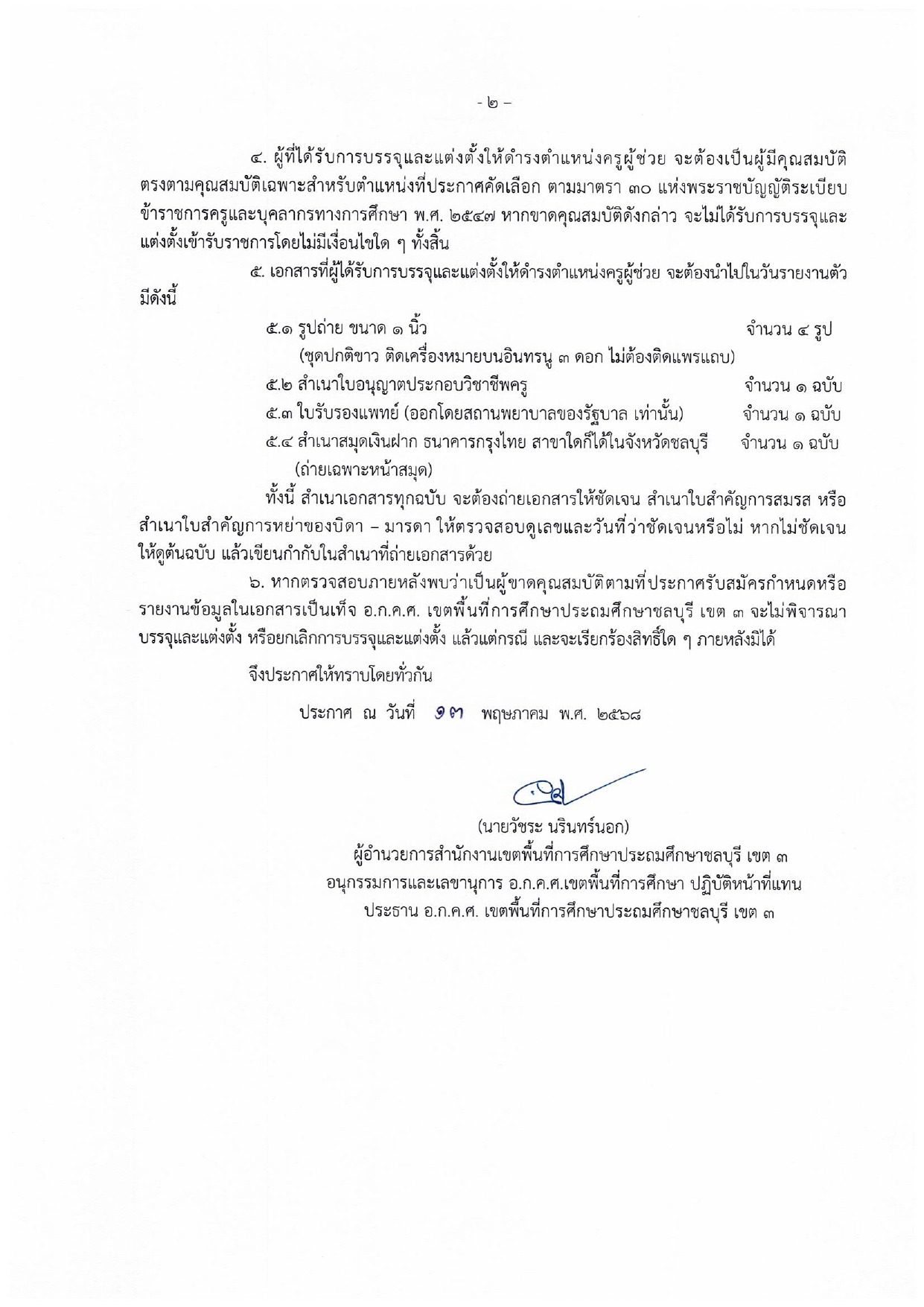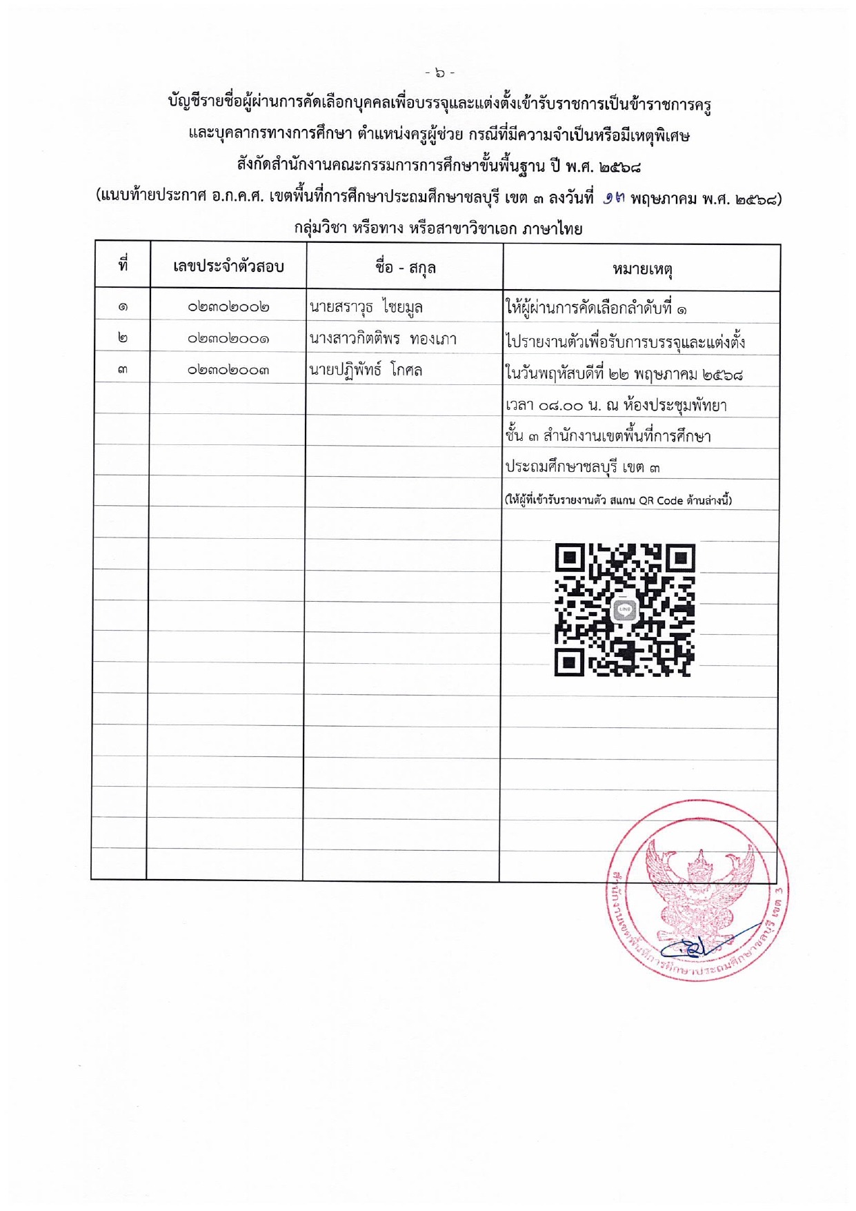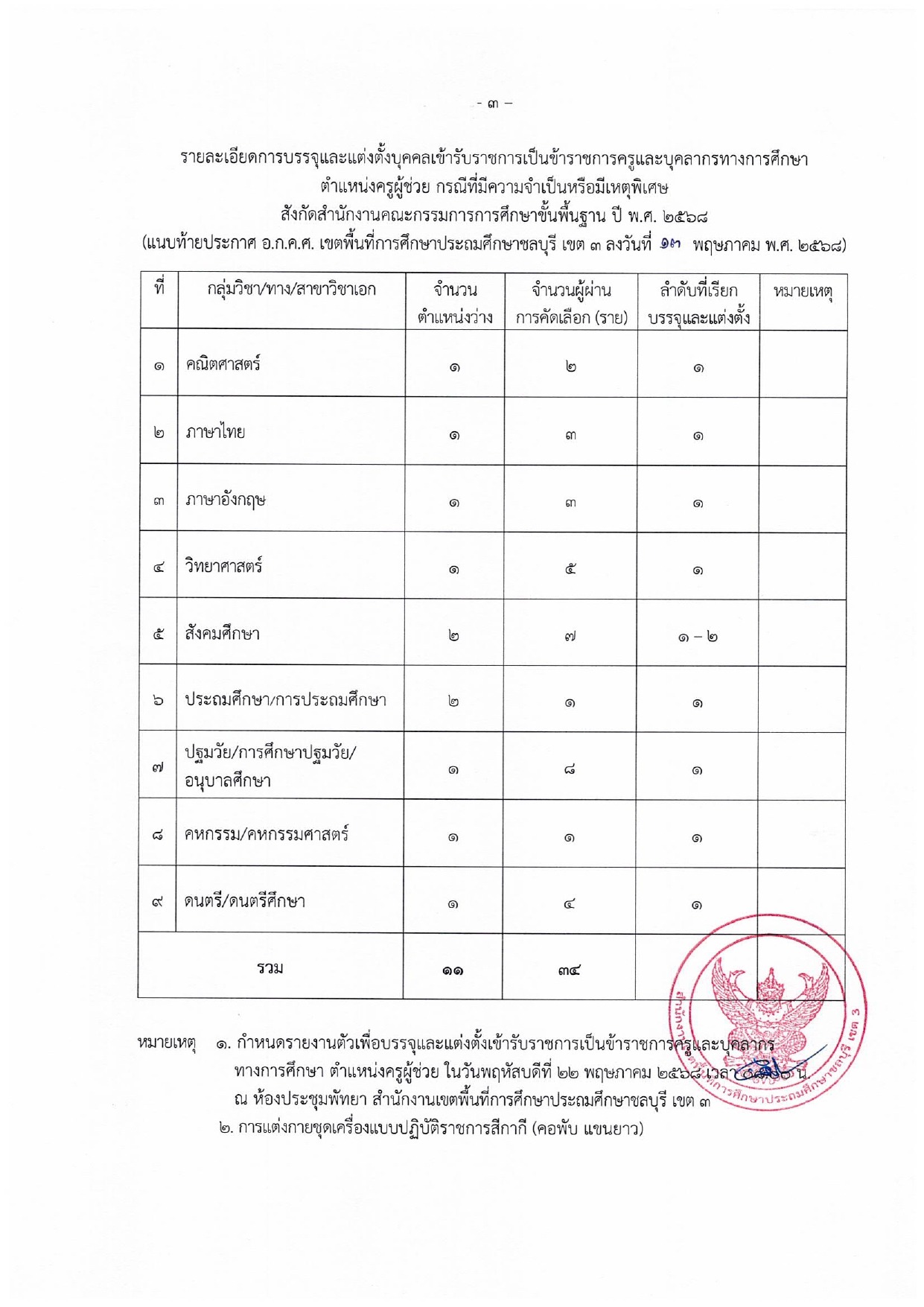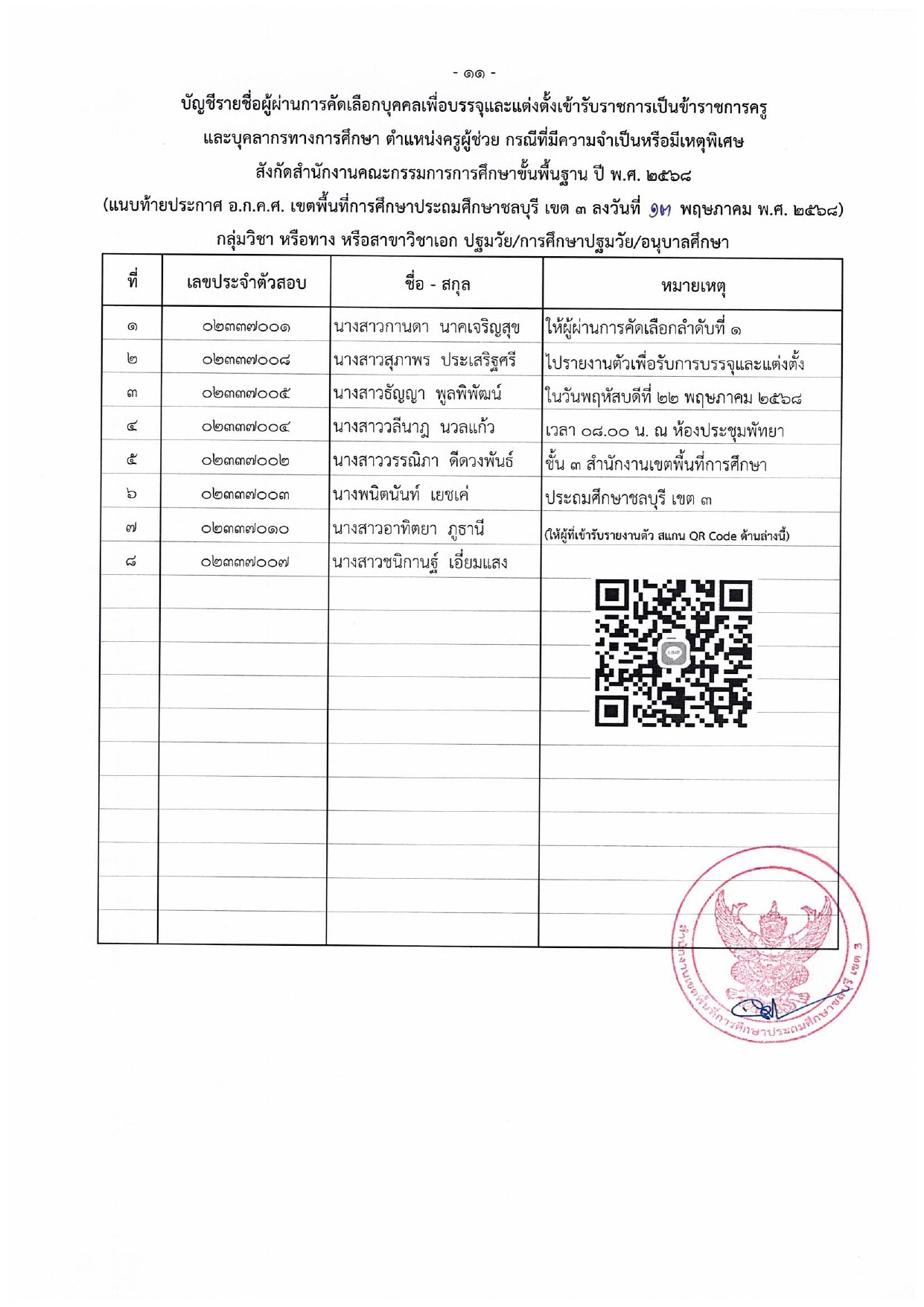📣ประกาศ อ.ก.ค.ศ.เขตพื้นที่การศึกษาประถมศึกษาชลบุรี เขต 3 ประกาศรายชื่อผู้ผ่านการคัดเลือกบุคคลเพื่อบรรจุและแต่งตั้งเข้ารับราชการเป็นข้าราชการครูและบุคลากรทางการศึกษา ตำแหน่งครูผู้ช่วย กรณีที่มีความจำเป็นหรือมีเหตุพิเศษสังกัดสำนักงานคณะกรรมการการศึกษาขั้นพื้นฐาน ปี พ.ศ. 2568 http://www.amss.chon3.go.th/modules/mail/upload_files/11009000865021747132115_1.pdf