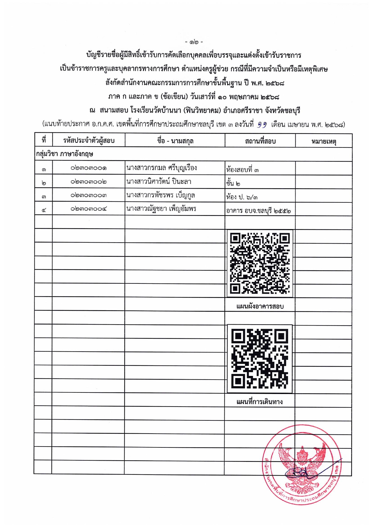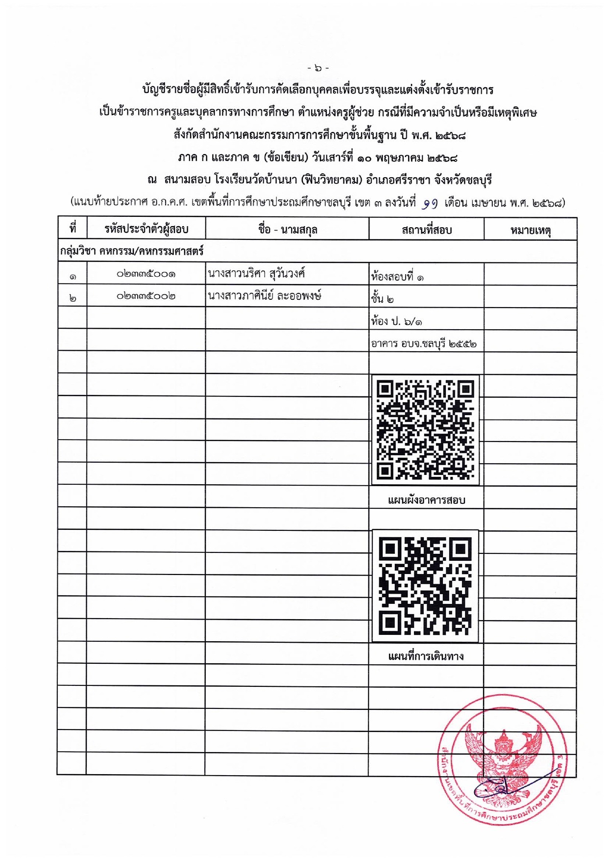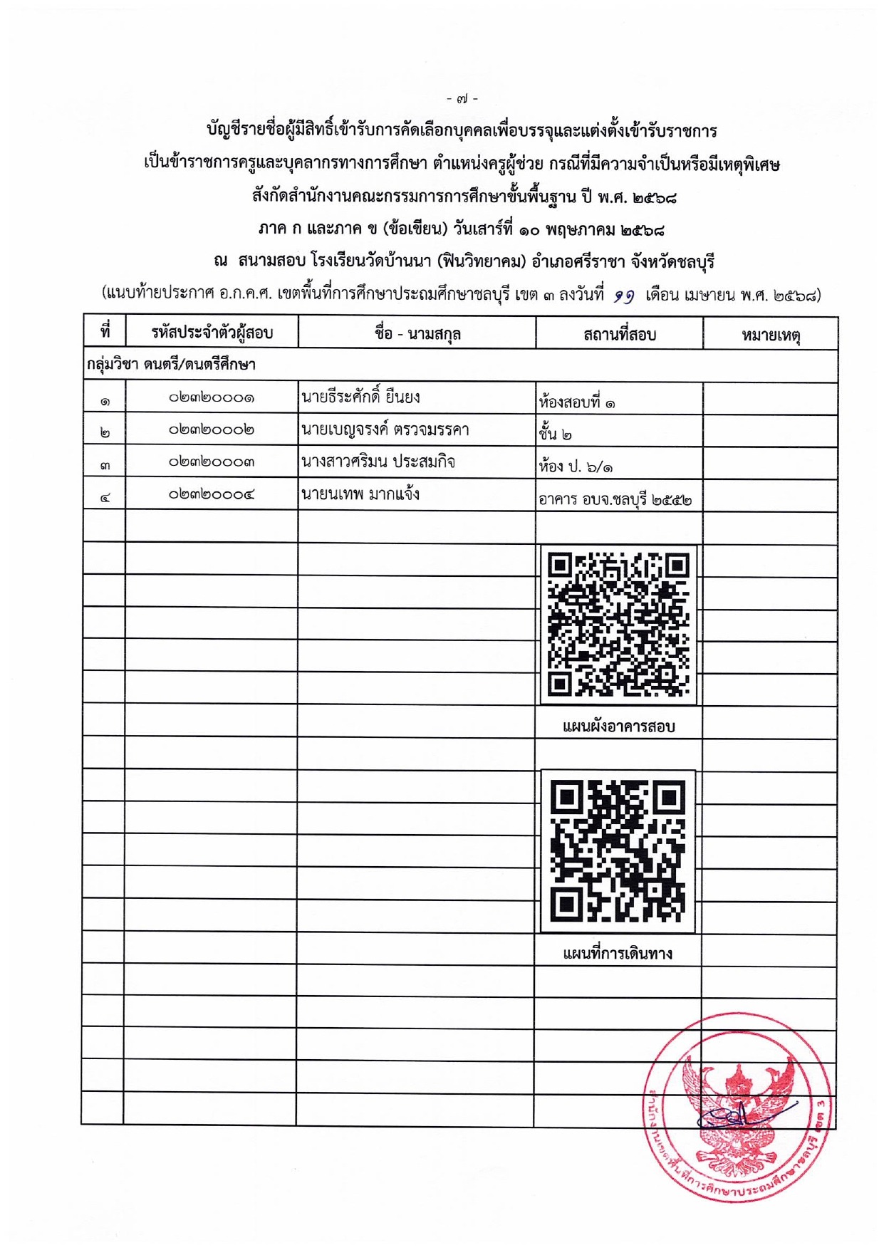 รายชื่อผู้มีสิทธิ์เข้ารับการคัดเลือกสอบข้อเขียน ภาค ก ภาค ข และสอบสัมภาษณ์ ภาค ค ในการคัดเลือกบุคคลเพื่อบรรจุและแต่งตั้งเข้ารับราชการเป็นข้าราชการครูและบุคลากรทางการศึกษา ตำแหน่งครูผู้ช่วย กรณีที่มีความจำเป็นหรือมีเหตุพิเศษ สังกัดสำนักงานคณะกรรมการการศึกษาขั้นพื้นฐาน ปี พ.ศ. 2568