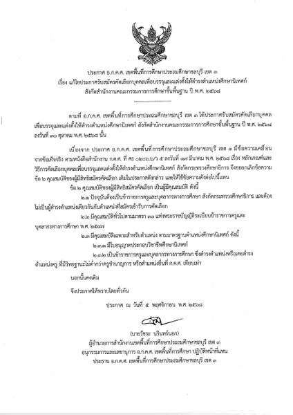 ประกาศ อ.ก.ค.ศ. สำนักงานเขตพื้นที่การศึกษาประถมศึกษาชลบุรี เขต 3 เรื่อง แก้ไขการรับสมัครคัดเลือกบุคคลเพื่อบรรจุและแต่งตั้งให้ดำรงตำแหน่งศึกษานิเทศก์ สังกัดสำนักงานคณะกรรมการการศึกษาขั้นพื้นฐาน ปี พ.ศ. 2568 https://www.facebook.com/share/p/1D7ezQrfj7/
