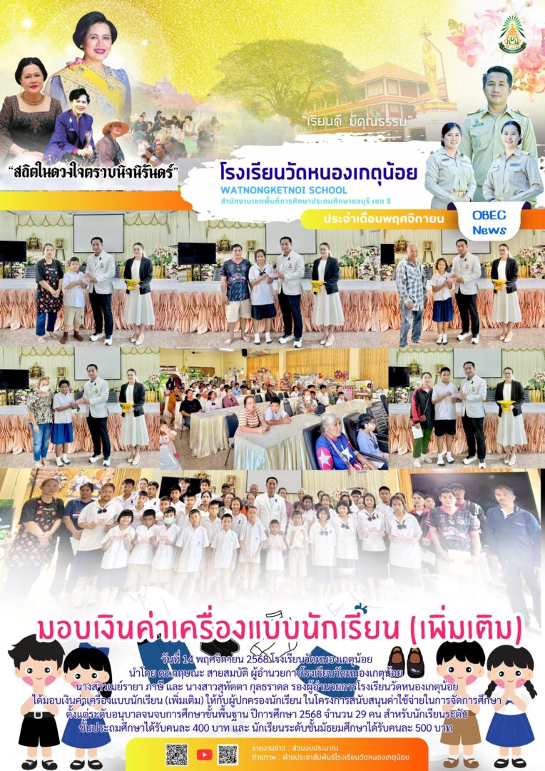 โรงเรียนวัดหนองเกตุน้อย ได้มอบเงินค่าเครื่องแบบนักเรียน (เพิ่มเติม) ให้กับผู้ปกครองนักเรียน ในโครงการสนับสนุนค่าใช้จ่ายในการจัดการศึกษาตั้งแต่ระดับอนุบาลจนจบการศึกษาขั้นพื้นฐาน ปีการศึกษา 2568 จำนวน 29 คน